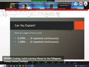 SEAQiM designs the Course on Joyful Learning in Mathematics Education, a program to provide mathematics teachers with a different perspective in teaching mathematics. This course engaged forty-one (41) teachers from primary schools in the Philippines to be well introduced to various joyful activities, discovering, exploring, and problem-solving wrapped in mathematics games and hands-on activities to promote meaningful learning. These activities will help students to achieve higher-order thinking skills (HOTS). With assistance and guidance from the SEAQiM facilitators, participants are invited to learn and explore the current issues and trends in mathematics education, the concept and principles of joyful learning in mathematics education, instructional strategies and approaches for joyful learning, outdoor mathematics, differentiated instructions in mathematics education and alternative assessment in joyful learning.
