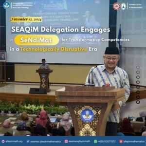 Yogyakarta, November 13, 2024 – A five-member delegation from the Southeast Asian Ministers of Education Organization Regional Centre for Quality Improvement of Teachers and Education Personnel in Mathematics (SEAQiM) recently attended Seminar Pendidikan Matematika (SeNdiMat) in Yogyakarta. Hosted by Balai Besar Guru Penggerak Provinsi DIY (BBGP DIY), the seminar gathered educators and experts nationwide to discuss “Transformasi Kompetensi Guru Matematika di Era Disrupsi Teknologi”.
