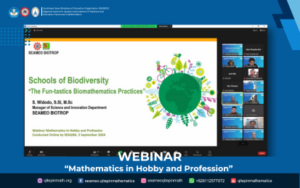 The second presentation, titled Schools of Biodiversity: The Fun-tastics Biomathematics Practices, was delivered by Slamet Widodo Sugiarto, S.Si., M.Sc., Manager of the Science and Innovation Department at SEAMEO BIOTROP. He shared insights into how mathematics is used in the study of biodiversity, explaining that mathematical models and equations are essential tools for predicting biological processes, analyzing ecosystems, and understanding the dynamics of biodiversity. His presentation offered practical examples of how mathematics helps scientists and biologists unravel the complexities of the natural world, inspiring educators to incorporate biomathematics into their teaching practices.